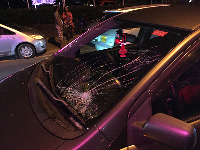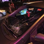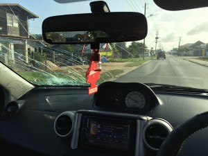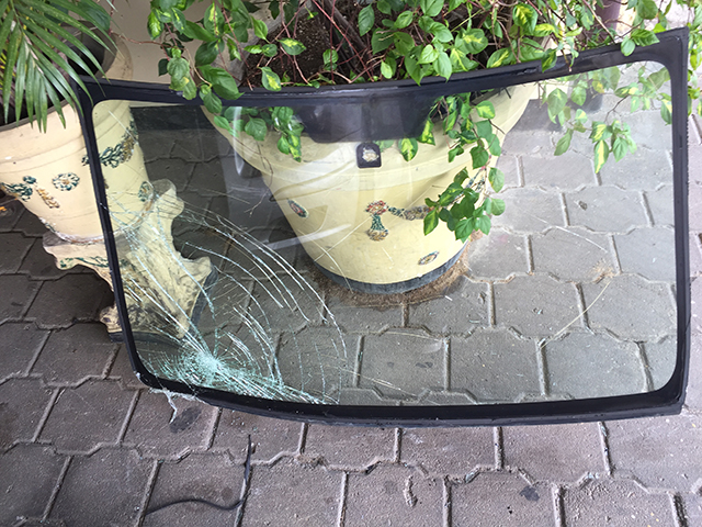 I think for a few seconds I was frozen in time and tried to make sense of what had just happened. All I saw a busted windshield and shards of glass on my dashboard and all over Dominique. I put on the hazard light, grabbed my phone and went to look at the damage from the outside. First instinct: CALL THE COPS!!