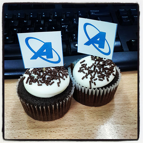 I had order 40 custom made cupcakes, but that didn’t go as originally planned. In the morning I received a message from the owner of the cupcake shop that there was a problem. The original order I had, were chocolate cupcakes with a buttercream topping and the office logo on top of it. The logo was supposed to be edible. The problem was that the person who was supposed to print out the edible logo had to rush to the doctor in the morning, so the cupcake shop owner improvised by printing out the logo on paper and adding it as a decoration with a toothpick. I was happy with the improvising.